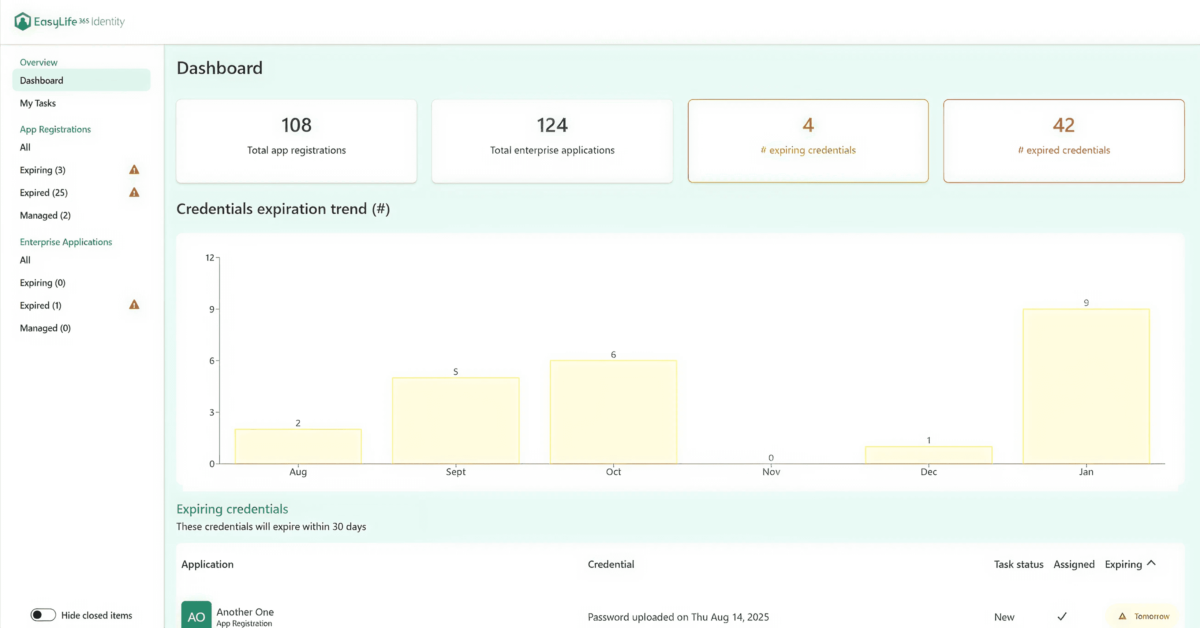 | Expiring credentials overview in EasyLife 365 Identity dashboard. |