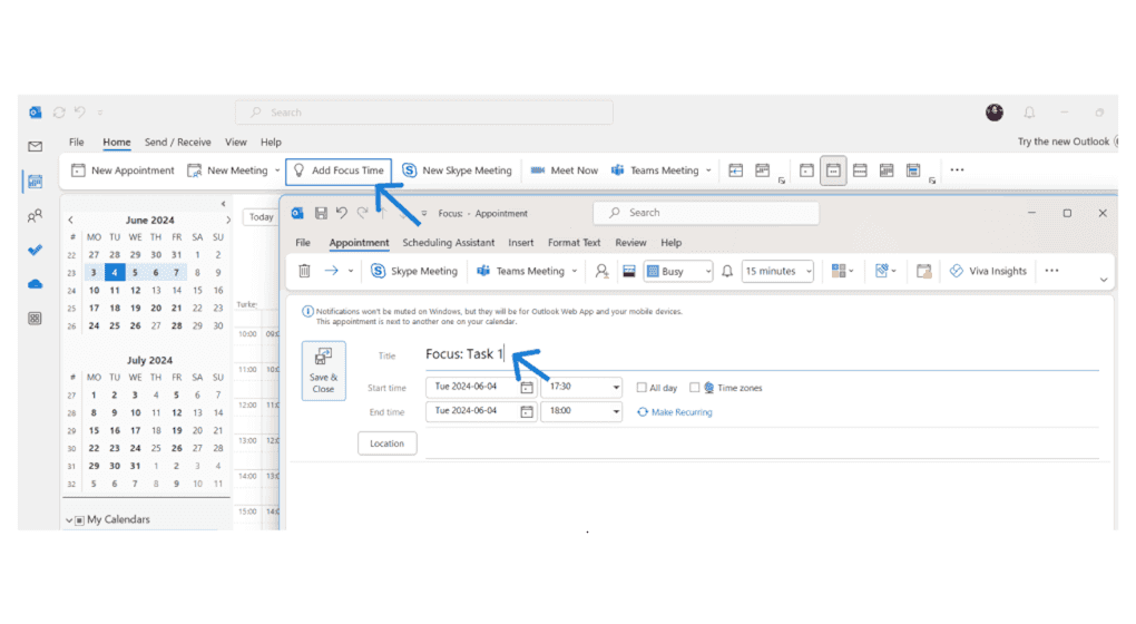 For example, Outlook provides an awesome feature where you can add “Focus Time.” This creates an appointment in your calendar and mutes the notifications on Outlook Web App and mobile phone. It also sets your Microsoft Teams status as “Do Not Disturb” (see the image above).