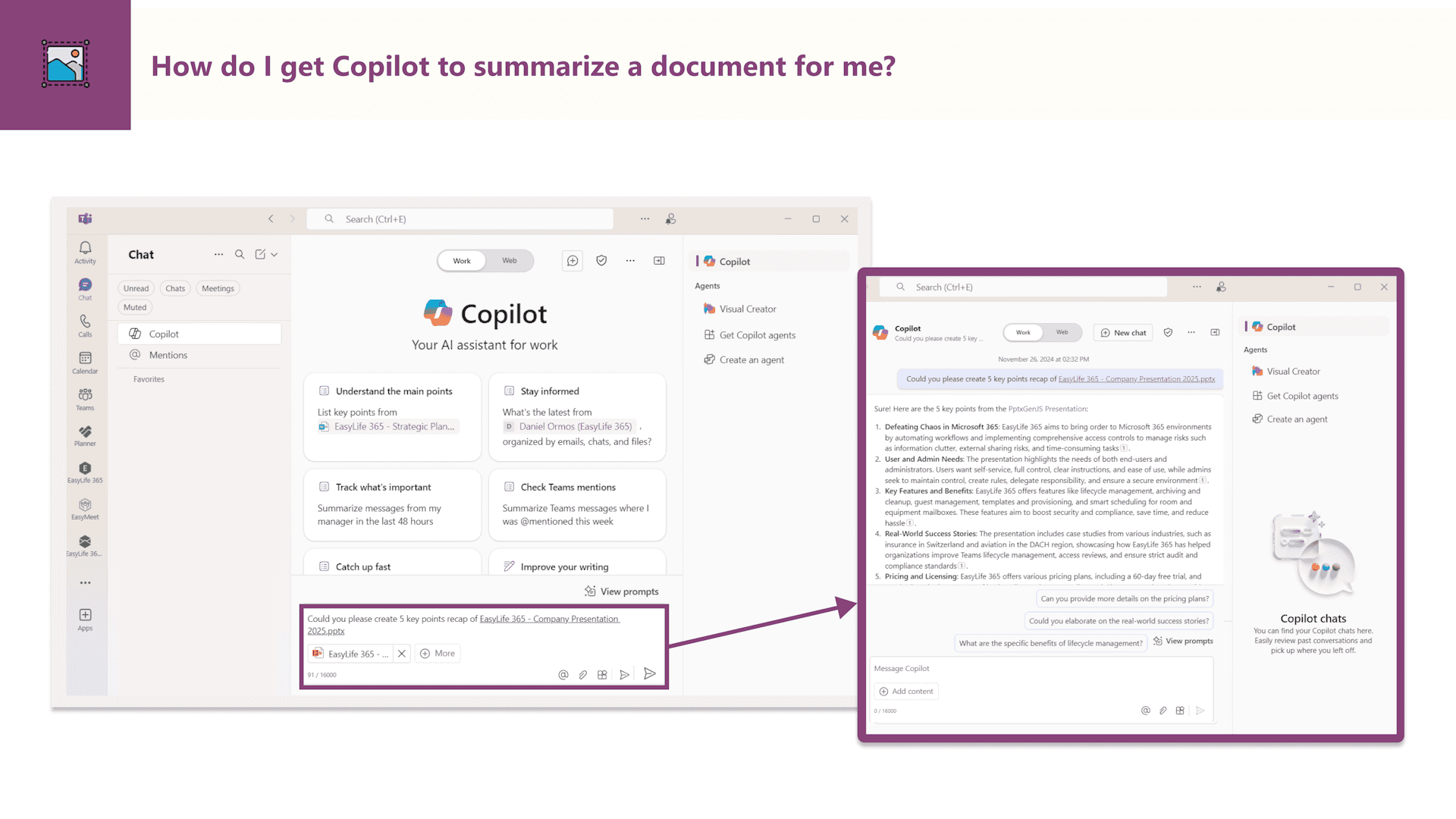 So, for example, if you would like to create a quick recap of a PowerPoint file in your tenant, you could ask: